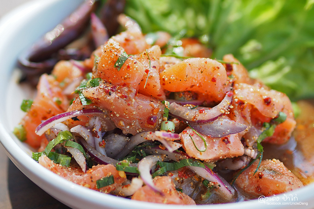 วันนี้สั่งอาหารไปหลายเมนูพอสมควร เริ่มต้นที่ลาบแซลมอน ราคา 290.- จัดว่าเป็นลาบแซลมอนที่รสชาติจัดจ้านถึงรส ถึงใจจริงๆ