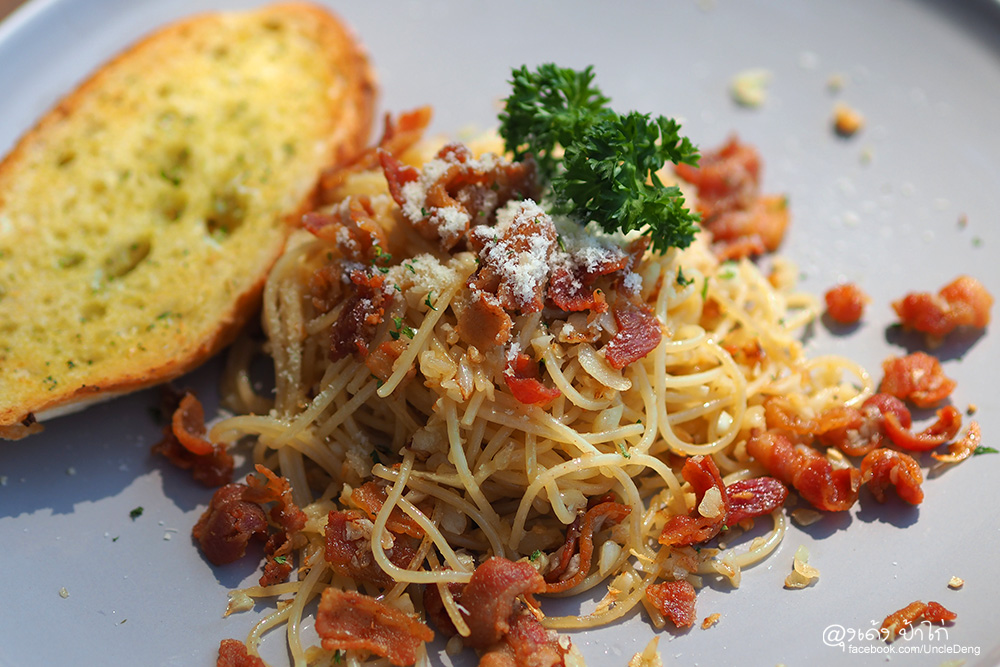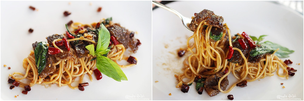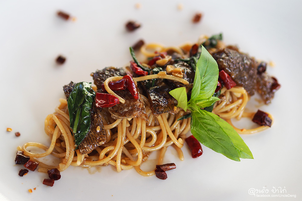 เมนูลูกชาย สปาเก็ตตี้เบคอนพริกแห้ง จานนี้ 200 บาท 1 อิ่มกำลังดี