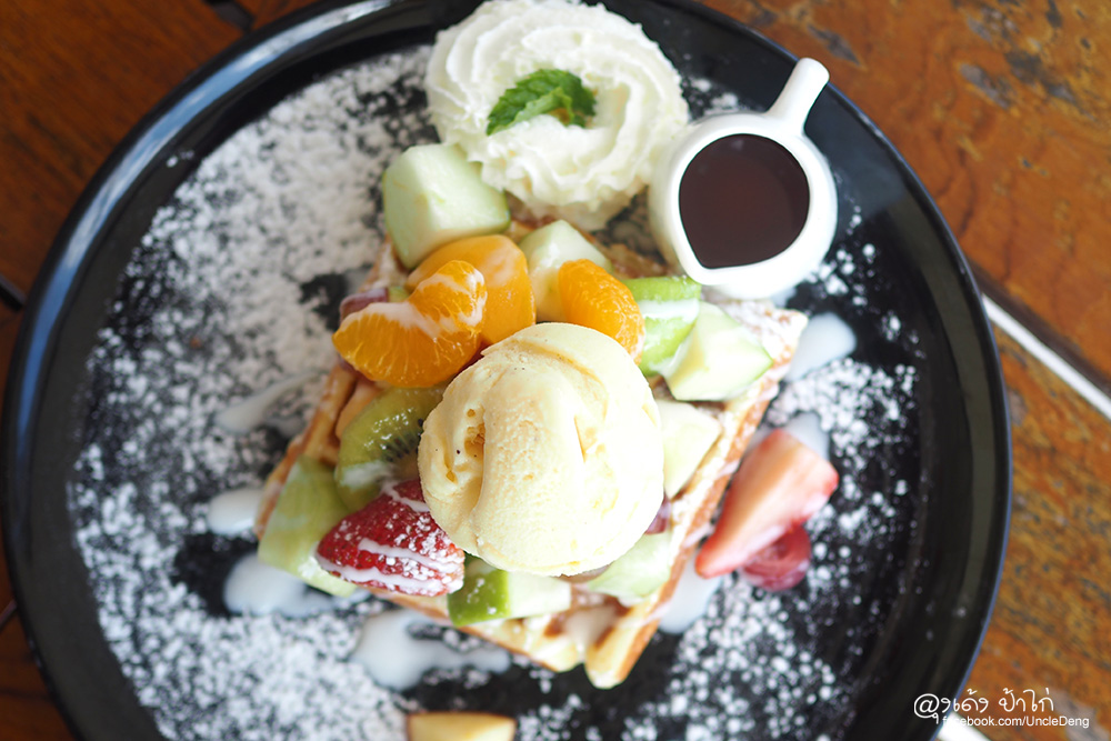 ลูกชายทั้ง 2 คน พี่เมฆ ภูผา บอกว่ายังอิ่มจาก The Glass House เลยสั่งแต่ของหวาน จานนี้ A La Mode Waffle จานนี้เหมาะมากกับสาวๆ เพราะเป็นวาฟเฟิลสไตล์เบลเยี่ยมสูตรเฉพาะของที่ร้าน ประดับด้วยผลไม้สดหลากชนิด ส้ม กีวี สตรอเบอรี่ แอปเปิ้ลแดง แอปเปิ้ลเขียว ราดด้วย white Chocolate dips เสิร์ฟพร้อมกับ Vanilla Ice Cream ราคา 225 บาท