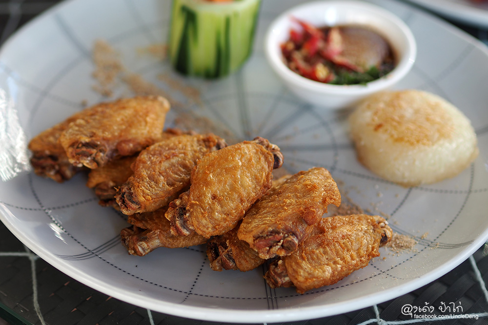 ปีกไก่ทอดน้ำปลา เสิร์ฟพร้อมกับข้าวเหนียวย่าง กินพร้อมกับน้ำจิ้มแจ่ว ราคา 140 บาท