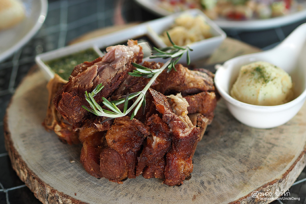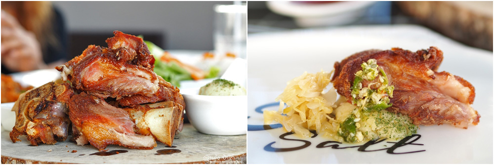 ขาหมูเยอรมัน ไขมันน้อย เพราะทางร้านมีเทคนิคในการรีดไขมัน ทอดสวยสีเหลืองทอง หนังกรอบเนื้อนุ่ม เสิร์ฟมาพร้อมกับ มันบด ซาวเคราท์ (Sauerkraut) ซอสหวาน และน้ำจิ้มสามรส ชุดนี้ 520 บาท