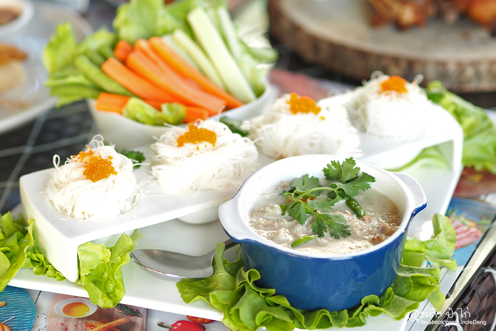 เส้นหมี่หลนกรรเชียงปู ในชุดมีเส้นหมี่ 4 ก้อนใหญ่โรยหน้าด้วยไข่ปลาสีส้มสดใส เสิร์ฟพร้อมกับผักสด และหลนกรรเชียงปู 1 ถ้วย ชุดนี้ 220 บาท