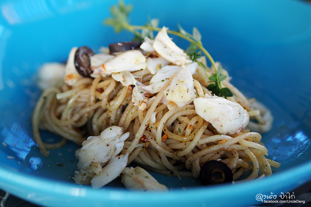สปาเก็ตตี้กรรเชียงปูพริกแห้ง (เนื้อปูชิ้นสวย โรยมาเยอะกว่าที่คาด) ในราคานี้ 220 จัดว่าไม่แพง