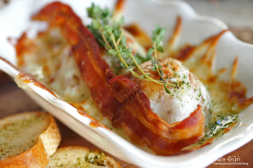 มันบดอบชีส จานนี้มีเสน่ห์ที่เบคอนอบกรอบ กินพร้อมกับมันบดอร่อยมาก 140 บาท