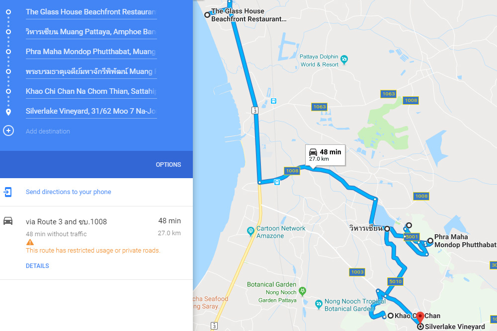 จาก The Glass House เดินทางไป วิหารเซียน / พระบรมธาตุเจดีย์มหาจักรีพิพัฒน์ / พระมหามณฑปพุทธบาท ภปร. สก. สะดวกมาก เพราะขับรถไปเพียง 30 นาที เท่านั้น จากนั้นเพื่อนๆ มีเวลาขับต่อไปอีกนิดก็จะถึง พระพุทธรูปแกะสลักเขาชีจรรย์ และ ไร่องุ่นซิลเวอร์ เลค