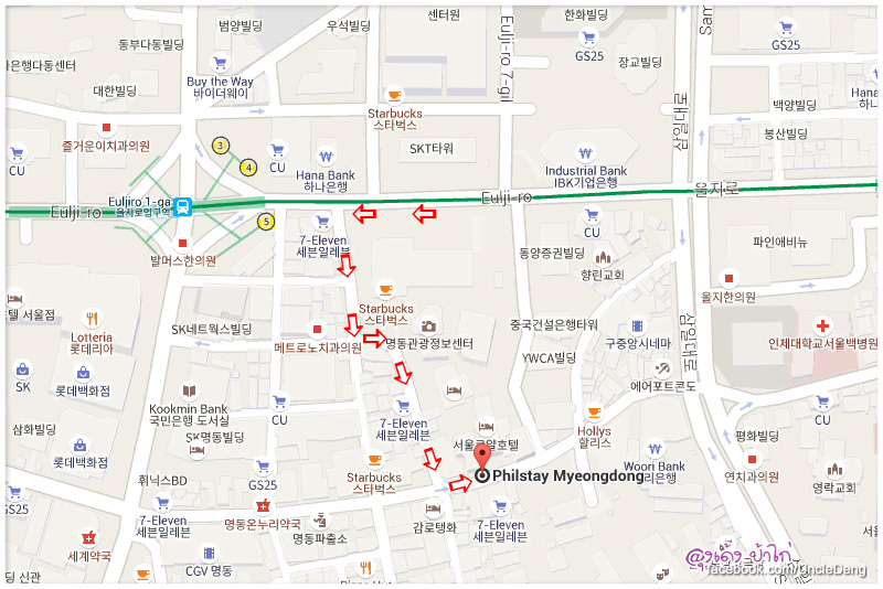 ลงที่สถานี Euljiro 1-ga ตรงข้ามตึก SK Blge จากนั้นเดินย้อนกลับมาตามลูกศรในภาพ