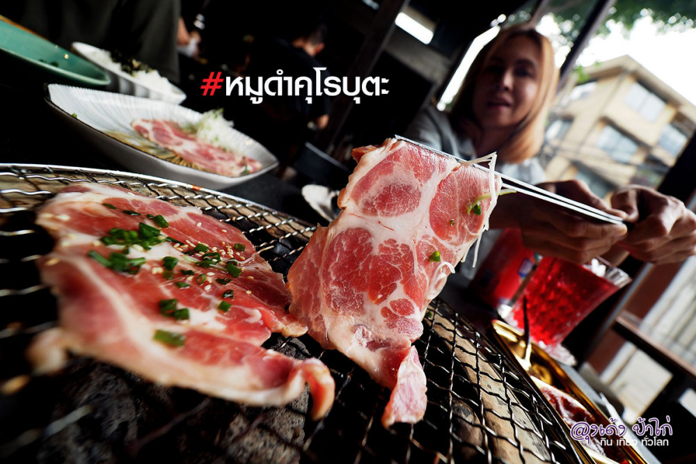 หมูดำคุโรบุตะ นี่ดีมากเลยนะ! ทางร้านเลือกใช้ส่วนของ คอหมูคุโรบุตะ ราดด้วยซอสของทางร้าน ย่างบนเตาถ่านร้อนๆ มันหยดติ๋งๆ นี่หอมมากเลย