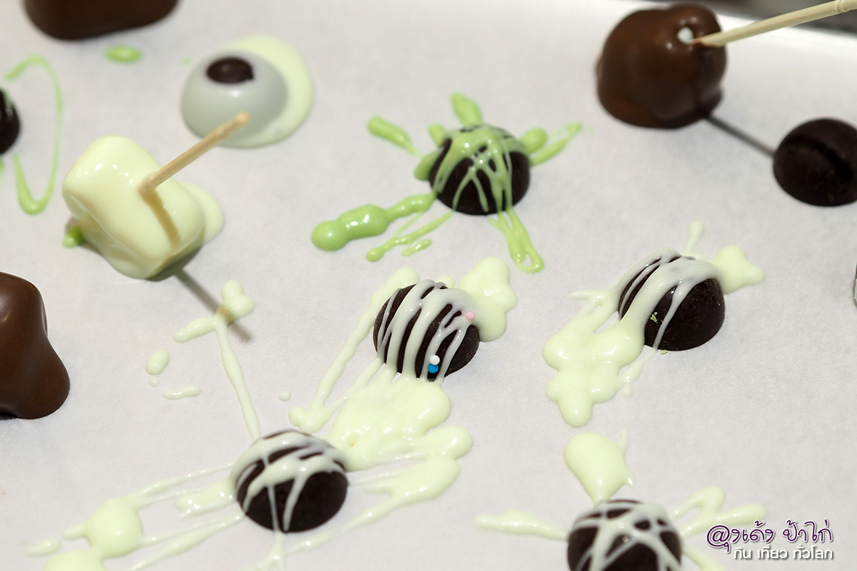 วิธีการตกแต่งลวดลายบนเมล็ดช็อกโกแลต จะมีคุณครูมาสอนเทคนิคต่างๆ