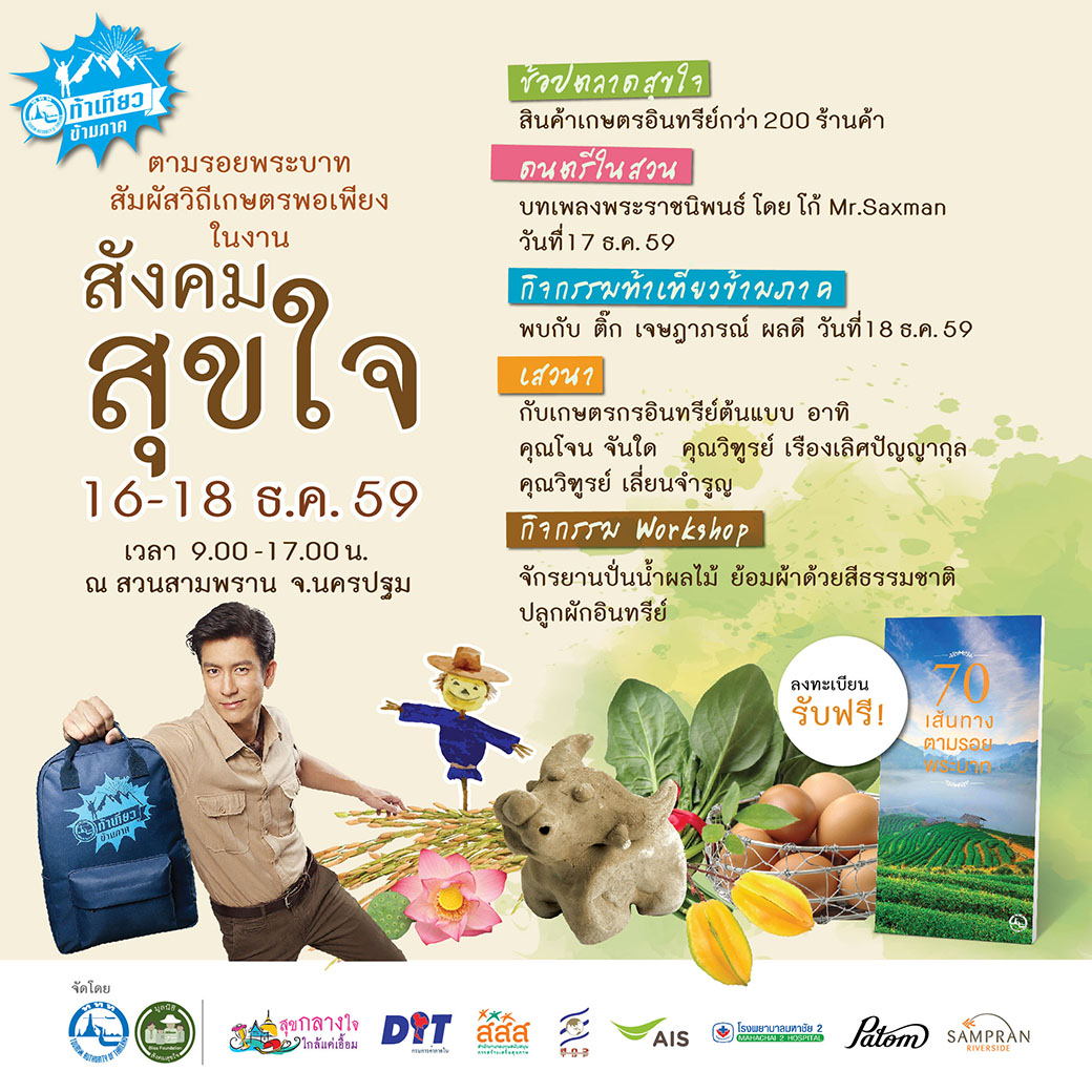 พลาดไม่ได้นะครับ มาร่วมตามรอยพระบาท สัมผัสวิถีเกษตรพอเพียงในงานสังคมสุขใจ ด้วยกันที่ วันที่ 16-18 ธันวาคมนี้ งานเริ่ม 10:00 - 17:00 ณ สวนสามพราน จ.นครปฐม