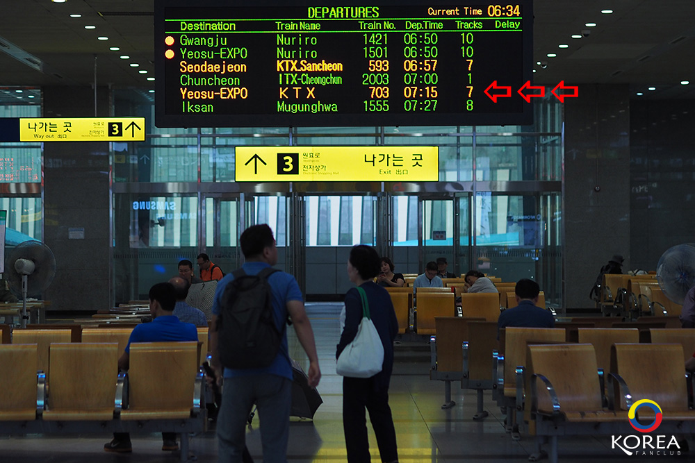 รถไฟ KTX จะมาตรงเวลา หรือถ้ามาก่อน หรือหลังเวลา ก็จะมีเสียงประกาศให้ทราบ... ถ้ามาก่อนเวลา ต้องดูให้ดีว่า ใช่ขบวนที่เราจะนั่งไปด้วยหรือป่าว (หรือถามคนแถวนั้นก็ได้เช่นกัน) นอกจากนั้น เรายังต้องดูด้วยว่า เราขึ้นถูกตู้หรือป่าว ในตั๋ว Car no. ระบุหมายเลข 16 (ตู้รถไฟหมายเลข 16) ถ้าใช่ก็ขึ้นเลย