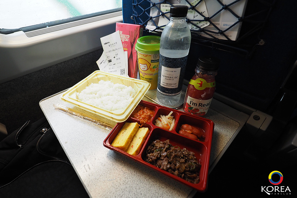 การนำอาหารขึ้นมากินบนรถไฟความเร็วสูง KTX ไม่ใช่เรื่องแปลก ใครๆ ก็ทำกัน และบนรถไฟขบวนนี้ก็มีอาหารว่าง ขนม เครื่องดื่มขาย จะซื้อจากด้านนอกหรือซื้อบนรถไฟก็ไม่มีใครว่า กินได้สบายใจ อาหารชุดกล่องนี้ก็ไม่แพง ข้าวสวย พร้อมกับข้าว ราคา 3,500 วอน (ประมาณ 105 บาท)