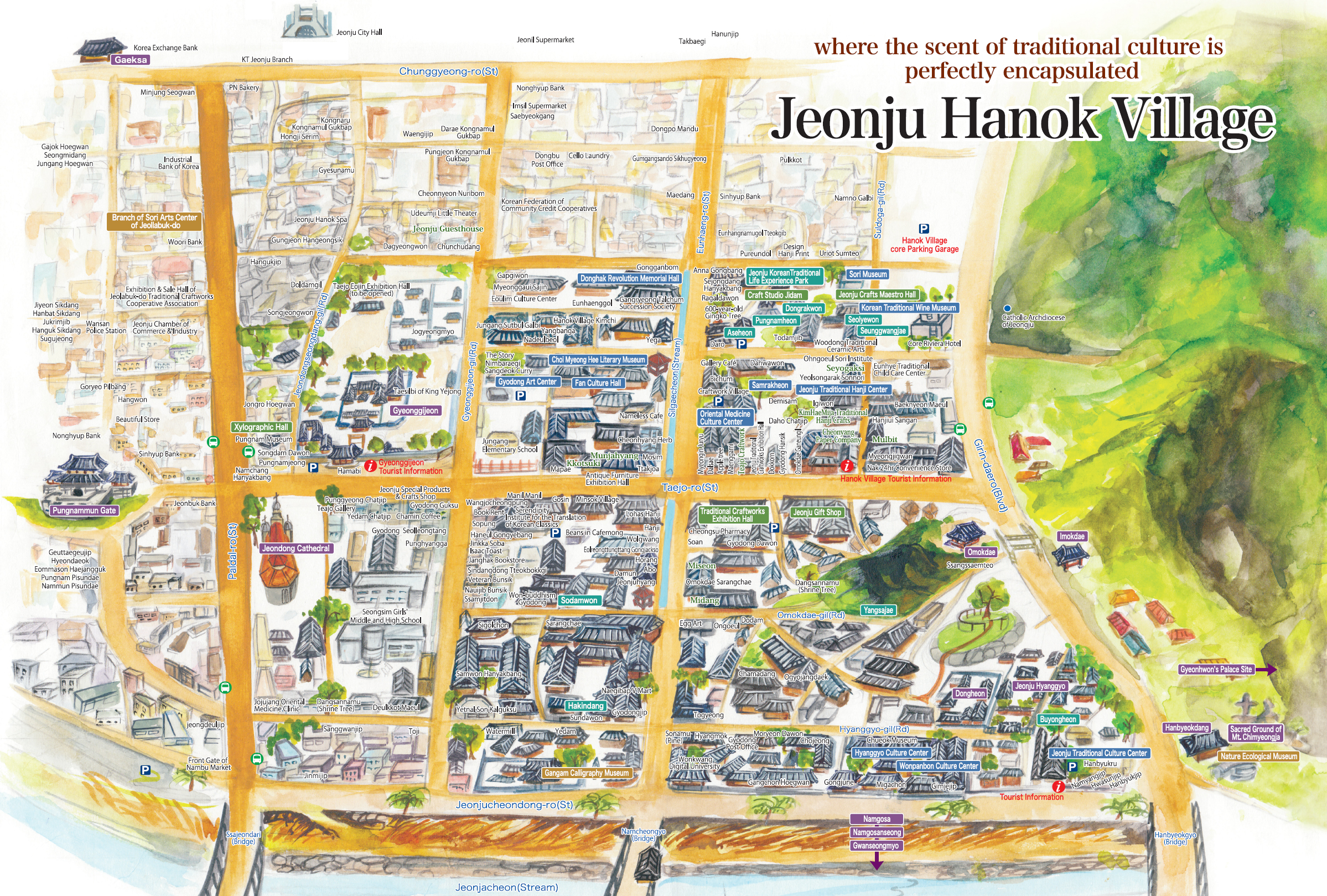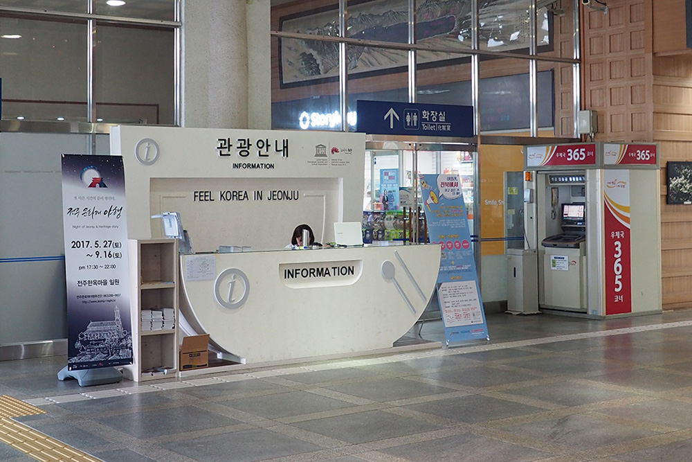 ภายใน Jeonju Station มี Information Center แนะนำให้เข้าไปขอ แผนที่ท่องเที่ยว เมืองจอนจู ภาษาอังกฤษ และแผนที่ภาษาเกาหลีที่มีรวมร้านอาหารท้องถิ่นใน หมู่บ้านโบราณ (Jeonju Hanok village) เมื่อได้แผนที่มานำมาเทียบกับแผนที่ภาษาอังกฤษ เราพอจะคำนวนที่ีตั้งของร้านนั้นๆ ได้