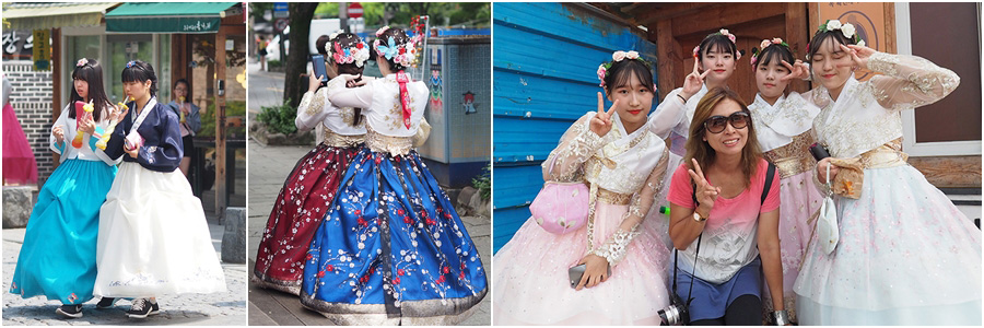 เสน่ห์ของหมู่บ้านโบราณแห่งเมืองจอนจู นอกจากจะเป็นเมืองเก่า นักท่องเที่ยวที่มาเยือนยังแต่งชุดฮันบก (ชุดประจำชาติเกาหลี) เดินชมเมือง ถ่ายรูปตามสถานที่ต่างๆ กันทั้งเมือง ด้วยค่าเช่าชุดเพียง (10,000-20,000 วอน / ประมาณ 300-600 บาท) เช้า-เย็น