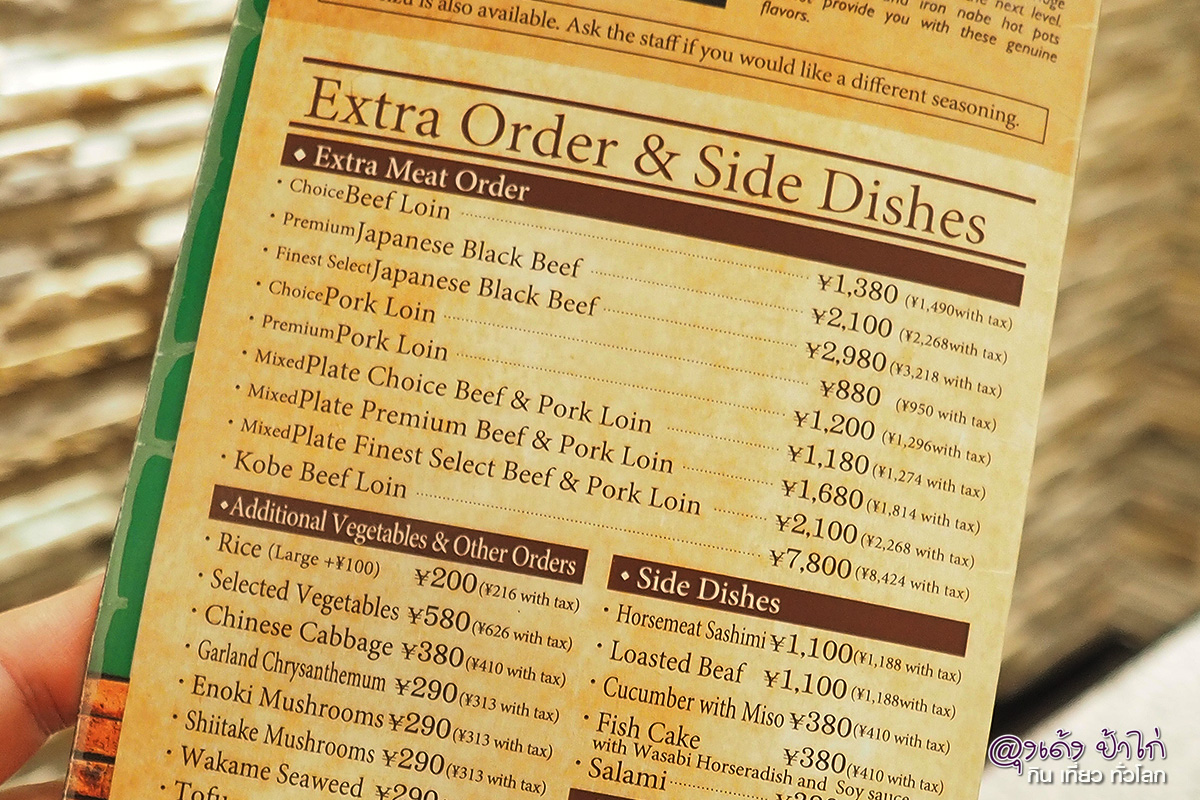 สั่งสบายๆ เพราะ ร้านนี้ มีเมนูภาษาอังกฤษ รูปภาพ พร้อมราคาชัดเจน ... เมนูไทยก็มีนะครับ ใครไม่กินเนื้อ ร้านนี้มีเมนูหมูด้วยนะ มี 4 ราคา เนื้อหมู จานเล็ก 1,490 เยน / จานใหญ่ 2,300 เยน และ เนื้อหมูอย่างดี จานเล็ก 1,880 เยน / จานใหญ่ 3,080 เยน ... หรือจะสั่งแบบ เนื้อครึ่ง หมูครึ่ง ก็ได้ครับ