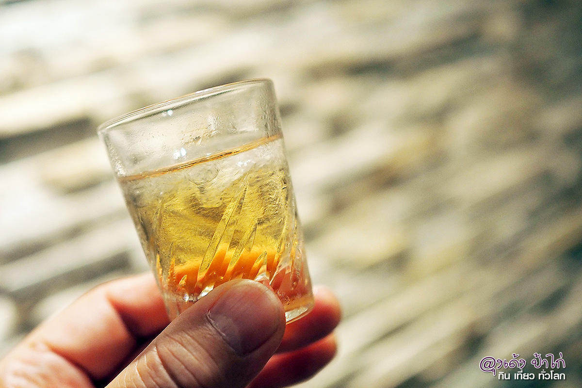 ก่อนเริ่มมื้อ ... ทางร้านจะมีเครื่องดื่มแอลกอฮอล์ มาให้คนละ 1 จอก ไว้ดื่มเรียกน้ำย่อย