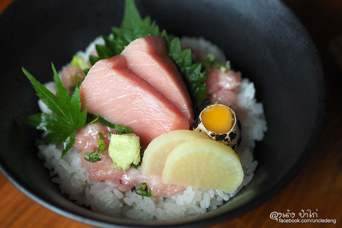 ข้าวหน้าปลาทูน่าหอมสับ เมนูข้าวสุดพรีเมียม ลิ้มรสชาติหอมมันจาก โอโทโร่ (otoro) ชิ้นโตๆ หนาๆ ถึง 2 ชิ้น ตามด้วยโอโทโร่สับ โรยด้วยต้นหอม เสิร์ฟพร้อมไข่นกกระทาดิบ