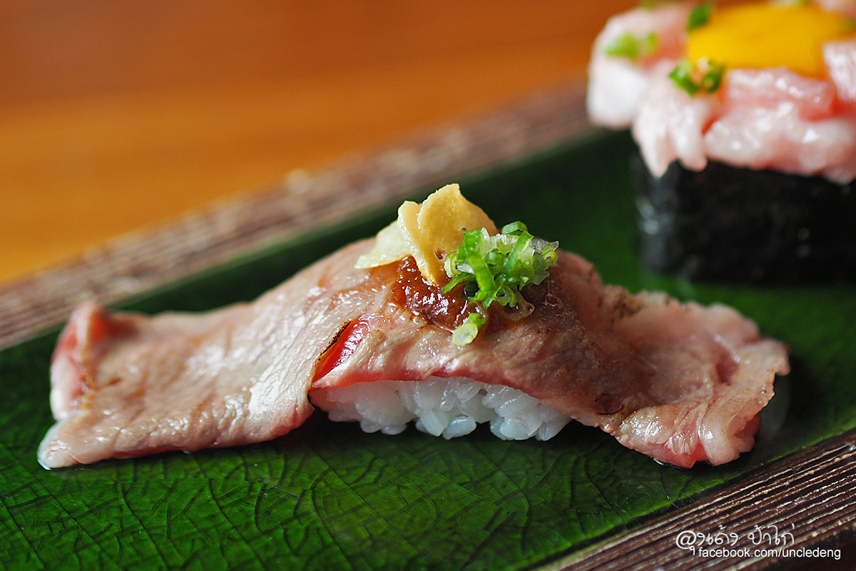 Beef Nigiri ชิ้นเล็กกว่า บิ๊กชีท กินคำเดียวได้สบายๆ ยังคงใช้ เนื้อวากิว Kagoshima ระดับ A4 สไตล์บางๆ ราดซอสเนื้อ กินคู่กับ กระเทียมสีเหลืองทอง และต้นหอม คำละ 220.-