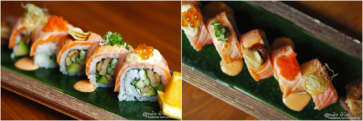 โรลระดับพรีเมี่ยม อัดแน่นด้วยตับห่าน ดโวคาโด ชีส พร้อมด้วยแซลมอน โดดเด่นด้วยซอส 5 ชนิด นั้นหมายความว่า แต่ละคำ รสชาติจะแตกต่างกัน เป็นเมนูที่กินแล้วสนุกมาก