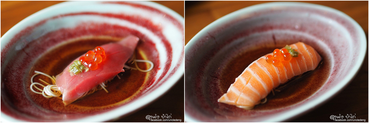 เส้นโซเมน ม้วนขนาดพอดีคำหน้าปลาทูน่า / แซลมอน / ฮามาจิ โรยหน้าด้วยวาซาบิดอง และไข่ปลาแซลมอน ราดด้วยซอสพอนชั้นดี รสเปรี้ยวนิดๆ กินแล้วสดชื่นมาก