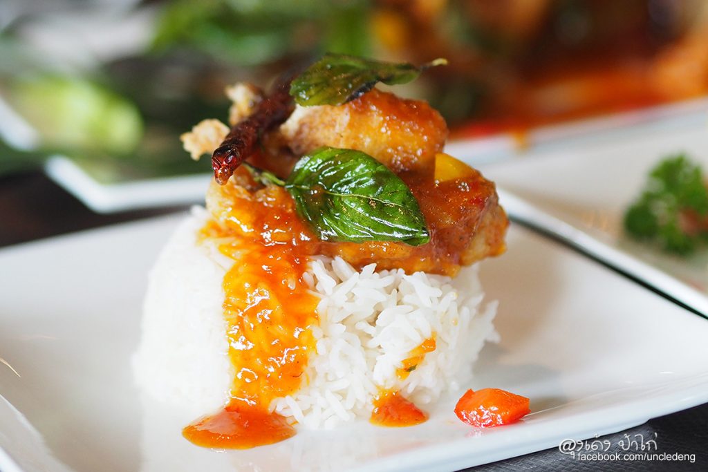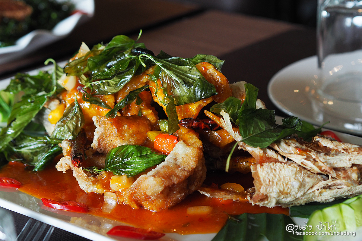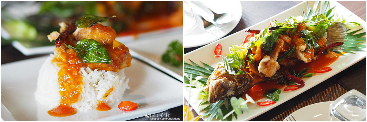 อีก 1 เมนูที่อยากให้มาลองชิมกันคือ ปลากระพง 3 รส ราคา 360.- เนื้อปลาทอดทอดกรอบสีเหลืองทอง ราดด้วยซอส 3 รส โดยด้วยใบโหระพาทอดกรอบ กินกับข้าวสวยร้อนๆ อร่อยที่สุด