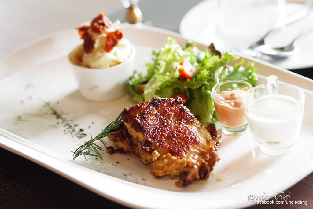 สเต็กไก่ย่าง หนังกรอบ จานนี้ มีไก่ 2 ชิ้น ราคา 185.- เสิร์ฟมาคู่กับมันบด โรยด้วยเบคอนกรอบ กินคู่กับผักสด และน้ำสลัด