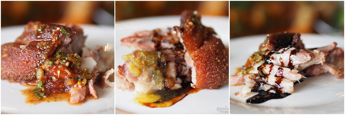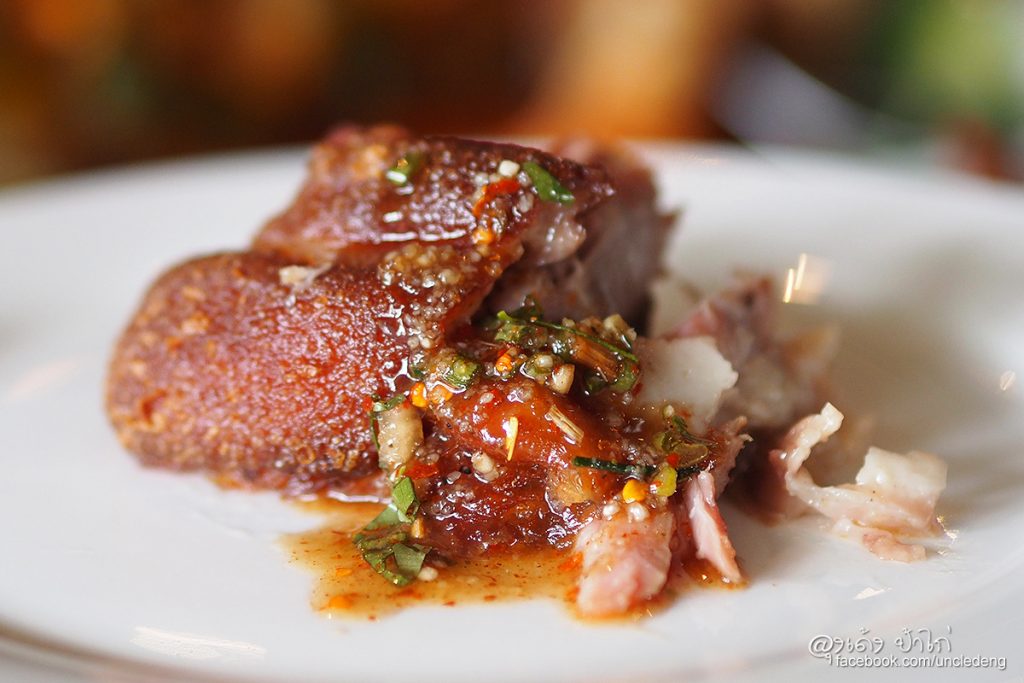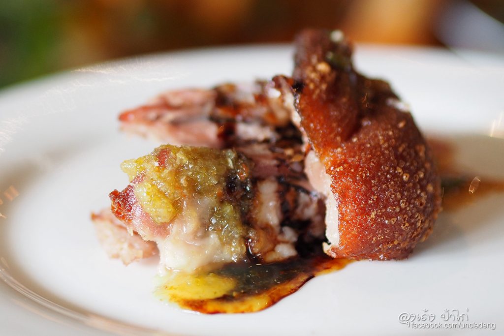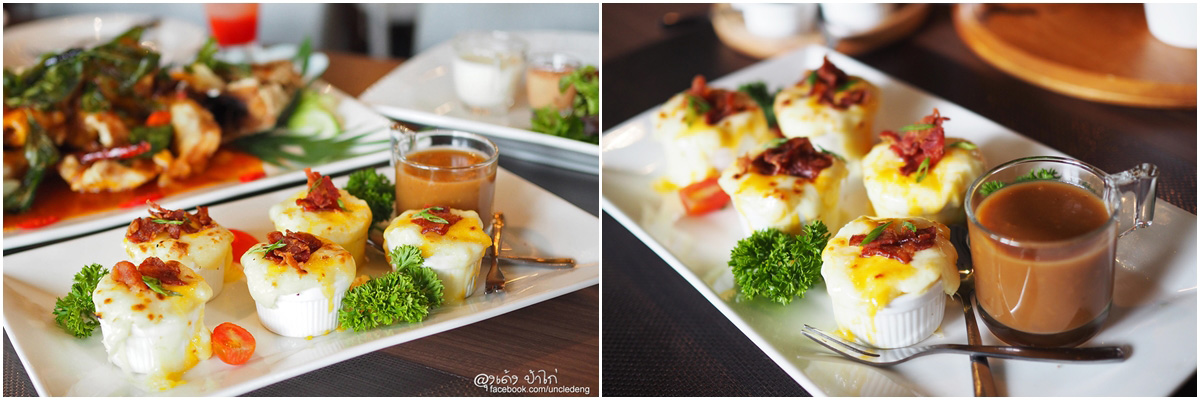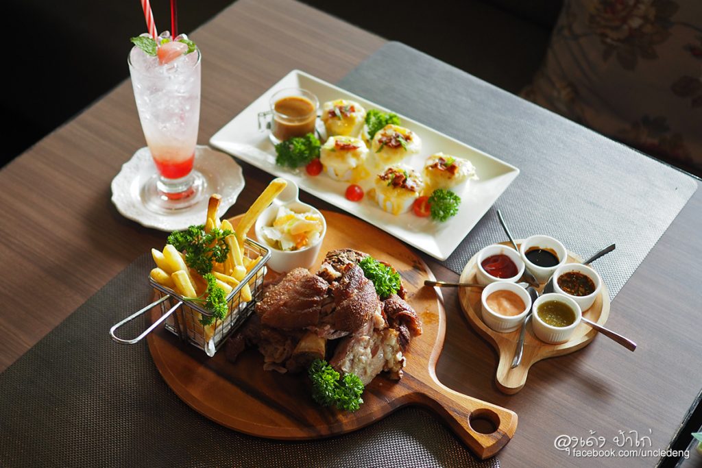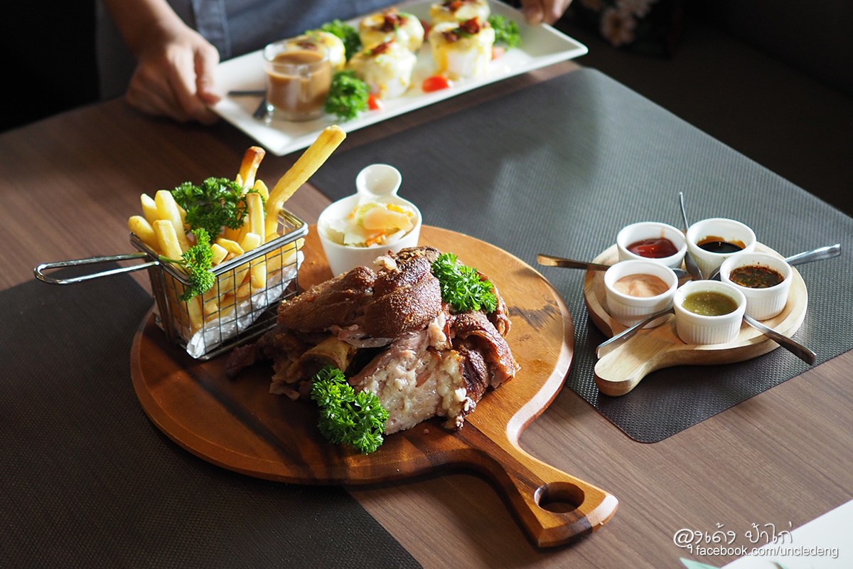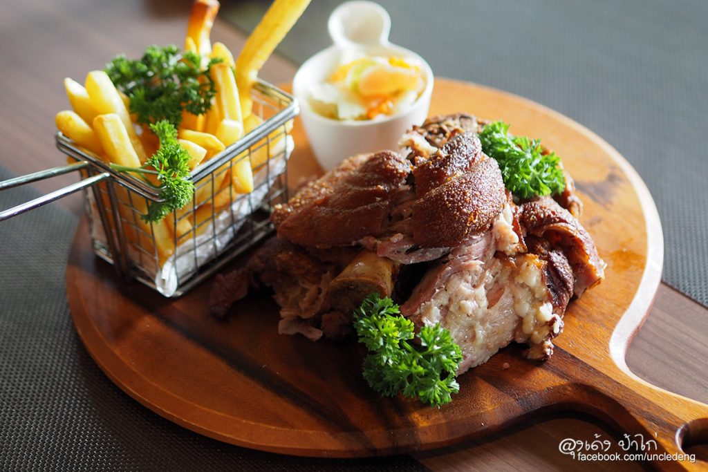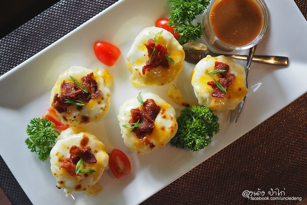 ถ้าสั่งขาหมูเยอรมัน หนังกรอบไปแล้ว ต้องตามด้วยมันฝรั่งอบชีส โรยหน้าด้วยเบคอนกรุบกรอบ เสิร์ฟมาพร้อมกับ Brown Sauce ที่เติมความหอม และความเผ็ดเล็กๆ ด้วยพริกไทยดำ ราคา 150.-