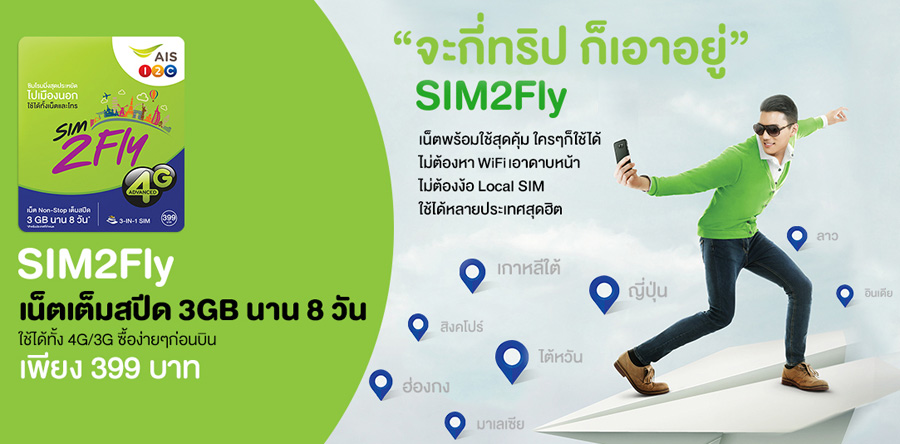 แนะนำ AIS SIM2Fly เล่นเน็ตได้ไม่จำกัด เต็มสปีด 3GB นาน 8 วัน จ่ายแค่ 399 บาท ใช้ได้ใน 8 ประเทศสุดฮิต ญี่ปุ่น เกาหลีใต้ สิงค์โปร์ มาเลเซีย ฮ่องกง ลาว อินเดีย และ ไต้หวัน สัญญาณดีไม่มีการสะดุด สามารถ Post Share Chat ได้ตลอดเวลา (ไม่ต้องเดินขาลาก หรือ นั่งแช่อยู่กับที่เพื่อใช้ WiFi ฟรีให้เสียเวลา)