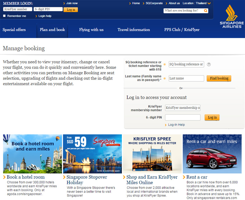 โดยเข้าไปที่ http://www.singaporeair.com เลือก Plan and book > Manage booking