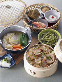 ประกอบด้วย ซุป บะหมี่เย็น และเครื่องเคียงจัดไว้สวยงามเสิร์ฟเป็นชุด