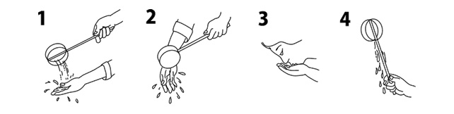 1. จับกระบวยด้วยมือขวา ตักน้ำให้เต็ม และเทรินลงมือซ้าย