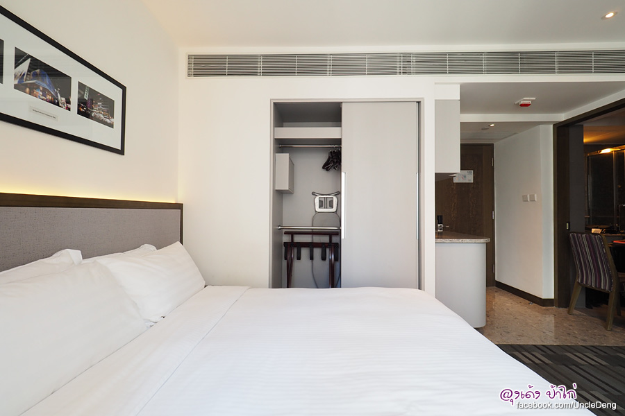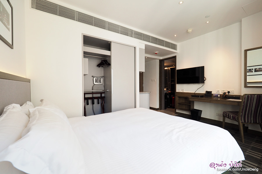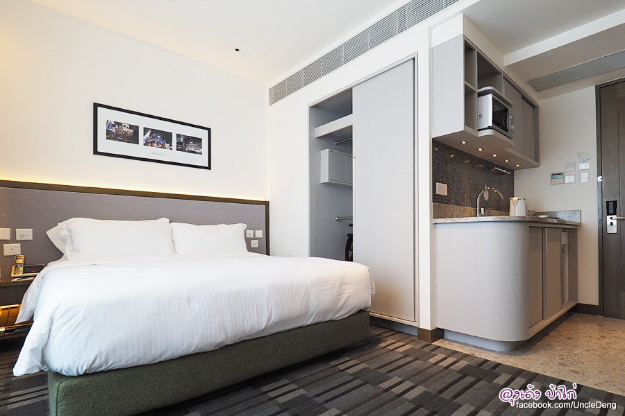 เตียงขนาด Queen Size ตู้เสื้อผ้า โต๊ะทำงาน ตู้ไมโครเวฟ ตู้เย็น อ่างล้างจาน ชั้นวางของ และ TV ติดผนัง