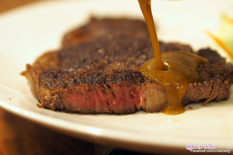 ลุงเด้งสั่ง Rib eye Steak สุกระดับ Medium เนื้อสีชมพูฉ่ำ นุ่มมากๆ ราดกับซอสพริกไทย