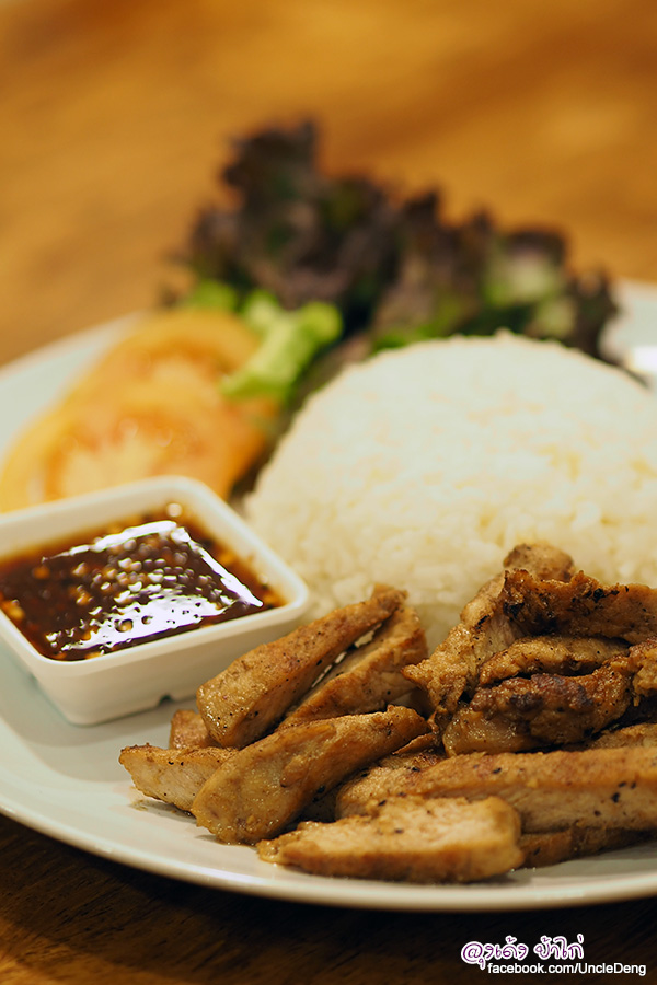ปิดท้ายด้วยเมนูป้าไก่ ข้าวหน้าหมูย่าง จานนี้ 80 บาท เสิร์ฟมากับน้ำจิ้มแจ่ว