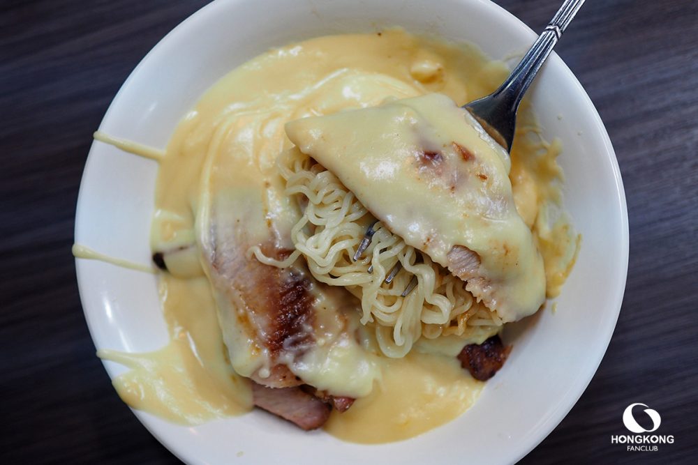 ว่าบะหมี่ราดชีสนี้ เป็นอาหารที่ปรับแล้วให้เข้ากับคนฮ่องกง เพราะฉะนั้นจะอร่อยแบบฮ่องกง