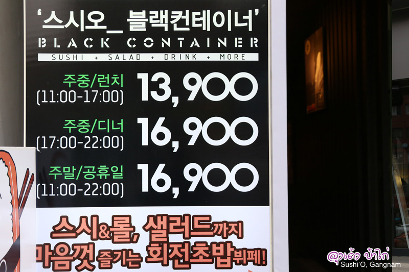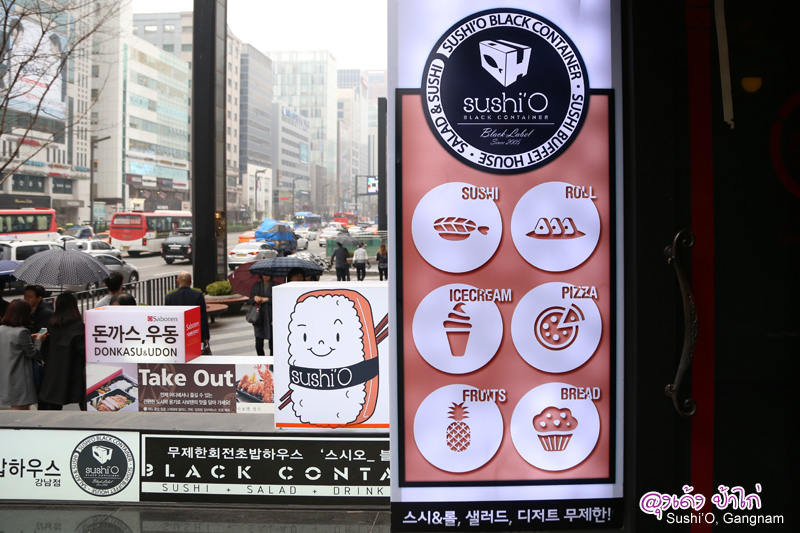 Sushi'O Black Container หรือเรียกสั่นๆ ว่า Shshi'O เป็นร้านบุฟเฟ่ต์ซูชิสายพาน ราคาประหยัด ในย่านกังนัม ร้านนี้เปิดตั้งแต่เวลา 11:00 - 22:00 ในแต่ละช่วงเวลาราคาก็แตกต่างกันหน้าร้านสังเกตง่าย มีป้ายบอกราคาชัดเจน แต่ละช่วงเวลาก็แตกต่างกันชัดเจน
