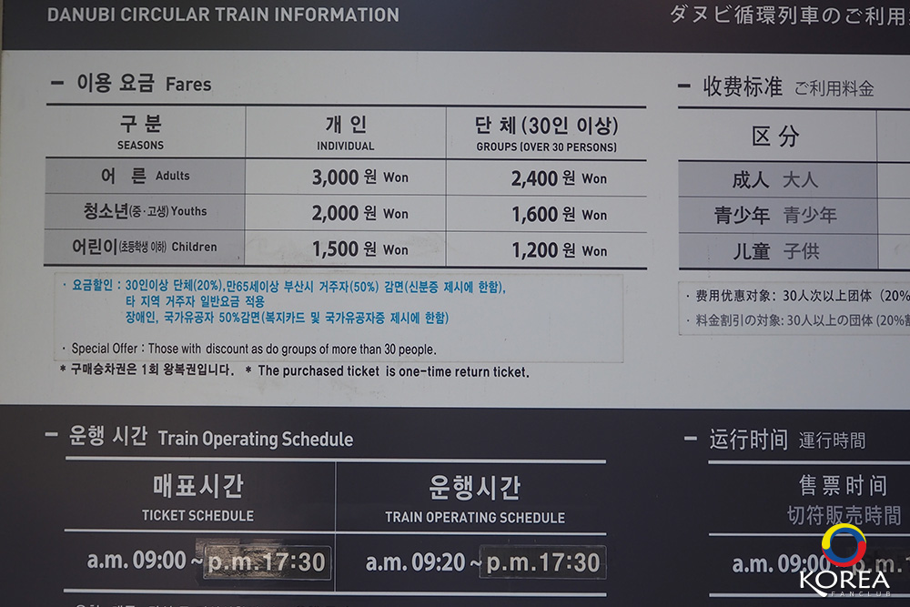 ผู้ใหญ่ 3,000 วอน / วัยรุ่น 2,000 วอน / เด็กเล็ก 1,500 วอน