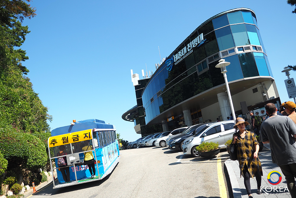 จุดรอรถ Danubi Train อยู่ด้านนอกอาคาร รอไม่นาน จากจุดนี้นั่งไปประมาณ 5 นาที ก็ถึง Yeongdo Lighthouse