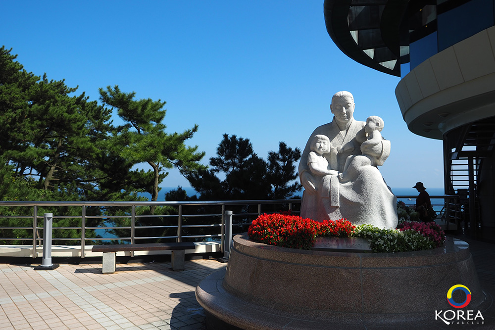 ด้านหน้าทางเข้าจะมีรูปปั้น The Statue of Mother and Children สร้างขึ้นในปี ค.ศ. 1976 เพื่อเตือนสติ คนที่คิดสั้นจะมาโดดหน้าผาฆ่าตัวตายที่ หน้าผาแทจงแด (Taejongdae) แห่งนี้ ความหมายของรูปปั้น แม่และเด็ก คือ เมื่อใดก็ตามที่เรามีปัญหา ยังมีคุณแม่ ที่พร้อมจะยื่นมือเข้ามาช่วยเหลือ พร้อมที่จะให้กำลังใจ และให้อภัยในความผิดพลาดของลูกแบบไม่มีเงื่อนไข (ลุงเด้งป้าไก่เชื่อว่า… ในอดีตต้องมีคนมาโดดหน้าผาฆ่าตัวตายที่บริเวณนี้อย่างแน่นอน)