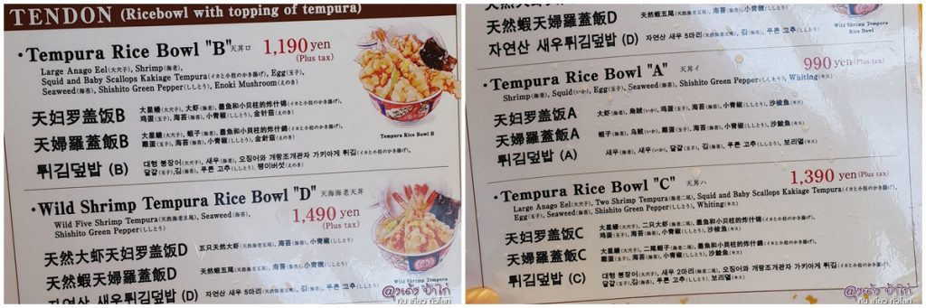 Tendon เมนู มีให้เลือก SET A B C D แตกต่างกันที่ TOPPING ใครชอบอะไร แบบใหนเลือกได้เลย มีเมนูเสริมอีกเล็กน้อย เช่นซุป และเครื่องดื่ม