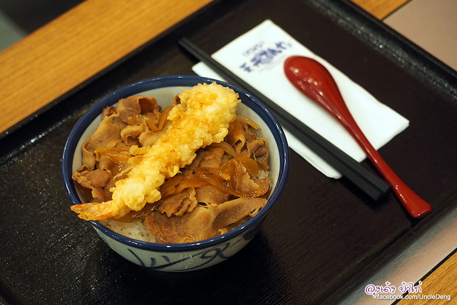 ข้าวหน้ากุ้งเทมปุระ และหมูผัดซอสไตล์ญี่ปุ่น (Ebi Ten Buta Don) ราคา 129 บาท หมูพรีเมี่ยมชิ้นใหญ่ นำมาผักกับซอสญี่ปุ่น และหัวหอม ให้รสชาติเข้มข้น เสิร์ฟมากับกุ้งเทมปุระชิ้นโต