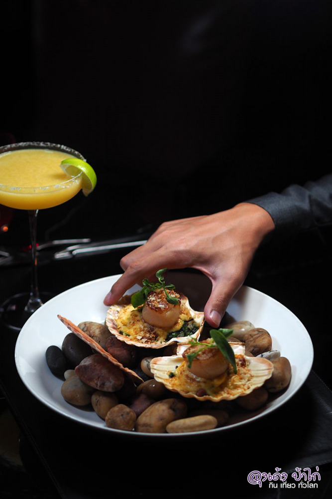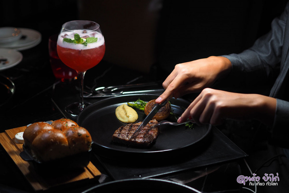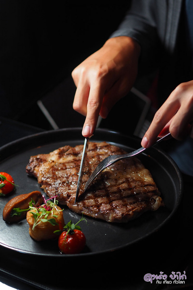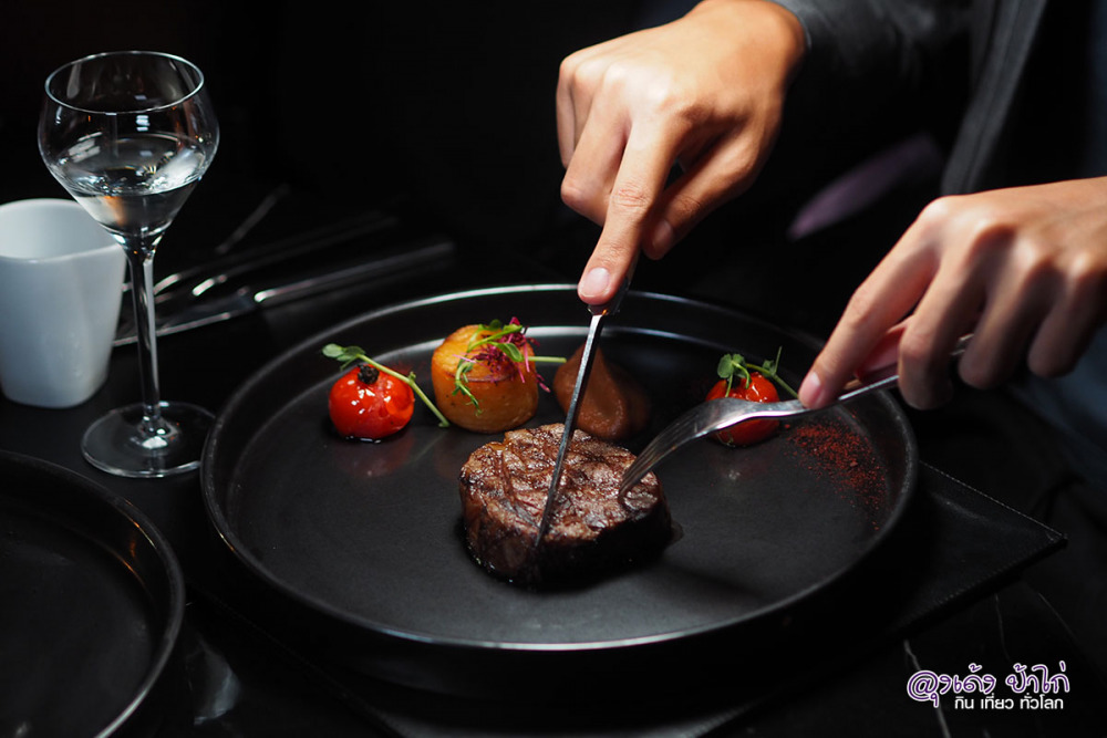 เสิร์ฟพร้อมกับ Potato dauphinoise | Baby Carrot | Black garlic puree และ ซอสพริกไทย