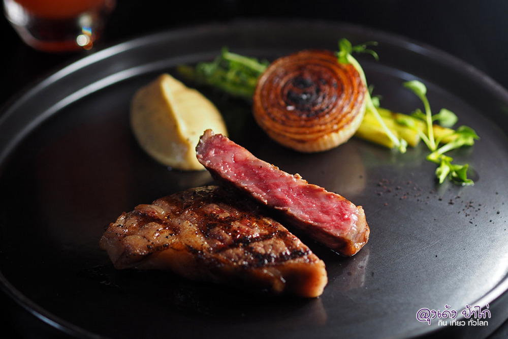 เนื้อวากิว ฮากาตะ (Hakata Wagyu) แท้จากเมืองฟุคุโอกะ ว่ากันว่า ... สายพันธุ์นี้ไขมันเยอะ และ หอมที่สุด เชฟเลือก สันนอก หรือ สตริปลอยน์ น้ำหนัก 150g. แต่หากต้องการความนุ่ม และความอร่อย ระเบิดในปาก ต้องชิ้นนี้เลย! ( เชฟเลือกเสิร์ฟ ชิ้นขนาด 150g. ลุงเด้งป้าไก่ คิดว่า เหมาะสมแล้ว เพราะเนื้อมีไขมันมาก ถ้าเสิร์ฟชิ้นใหญ่กว่านี้ คำแรกๆ จะอร่อย แต่คำหลังๆ อาจจะเลี่ยนได้ )