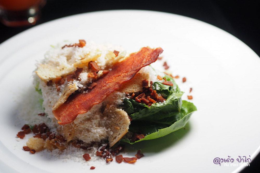 ซีซาร์สลัด ระดับใช้ชื่อร้านมาเป็นชื่ออาหาร ก็ต้องมีความพิเศษ ... จานนี้เค้าใช้ผัก ใจกลางผักกาดโรเมน (Romaine Lettuce) หรือผักกาดคอส (Cos Lettuce) เสิร์ฟพร้อมกับ เบคอนทอดกรอบ และ ชีสพามีซาน "PARMIGIANO REGGIANO" ให้รสชีสที่เข้มข้นมากๆ สลัดผักจานนี้ 350.-