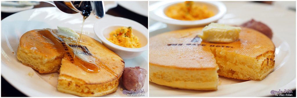 แพคเค้ก ... จัดว่าดี เสิร์ฟมาชิ้นโต หนา เนื้อแน่น แต่นุ่ม กินกับเนยสด ราดเมเปิ้ลไซรับ อร่อยสุดๆ - ในชุดมี Scrambled eggs 1 ฟอง กับ ใส้กรอก 1 ชิ้น