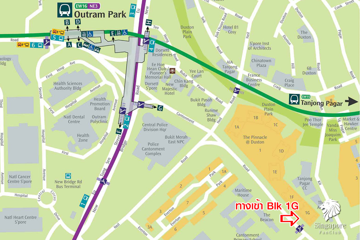 การเดินทาง สถานี Outram Park ทางออก G เดินประมาณ 10 นาที สังเกตุ สะพานลอย ทางเข้าอาคารอยู่ที่ Block 1G ( Blk 1 G )