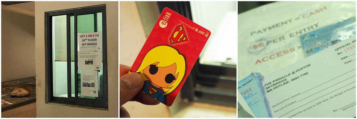 เคาน์เตอร์ติดต่อ ... เหมือนสำนักงาน รปภ. ตึก ไม่ได้เลิศหรูอะไร ค่าขึ้นชมวิว คนละ SG$ 6 เหรียญ (เงินสดเท่านั้น) และที่สำคัญที่สุด " ทุกคนต้องมีบัตร EZ-Link เพราะ เราจะใช้บัตรนี้เป็น เหมือน KEY CARD ในการเข้าไปชมวิว " หมายเหตุไว้ตรงนี้เลย... แตะบัตร ได้เพียงครั้งเดียวเท่านั้น
