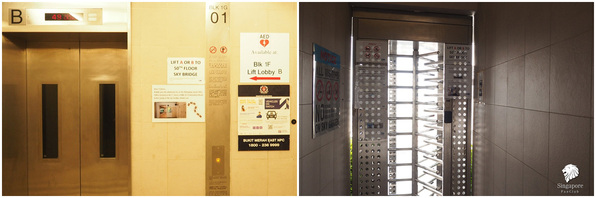 หลังจากที่ลงทะเบียน บันทึกข้อมูลลงในบัตร EZ-Link แล้ว ก็เดินไปขึ้น ลิฟท์ กดชั้น 50 SKY BRIDGE ... เมื่อออกจากลิฟท์แล้วก็เดินไปที่ ประตูเหล็ก ตรงนี้สำคัญมากนะครับ ... ประตูเหล็ก เล็กมาก เราต้อง จัดการตัวเองให้เรียบร้อย (กระเป๋าสะพาย กล้อง ขาตั้งกล้อง จัดการให้ดี) เพราะ หลังจากที่เรา แตะบัตร เราจะหมุนประตูได้เพียง 1 ครั้งเท่านั้น ห้ามพลาดเด็ดขาด - ลุงเด้ง ต้องเอาตัวเองเข้าไปจัดระเบียบ ใน ช่อง 3 เหลี่ยม ก่อน (แน่นมาก - พื้นที่จำกัด) แล้วค่อยแตะบัตร แล้วค่อยดันประตู