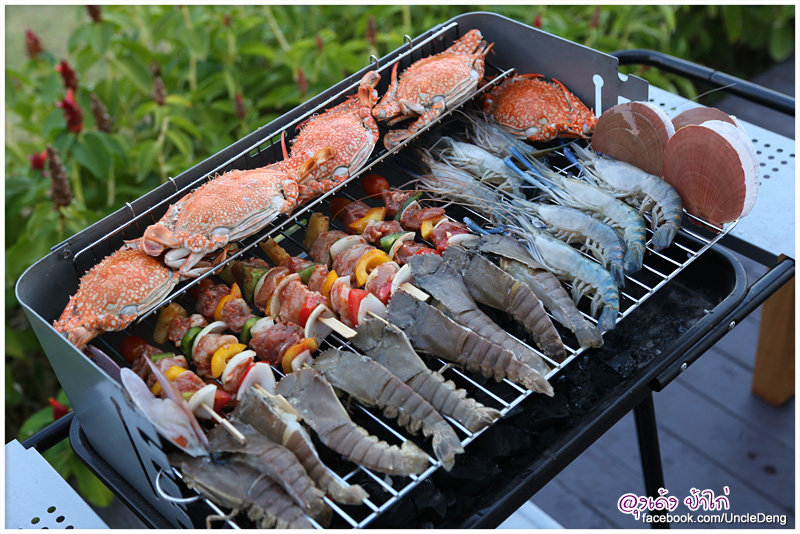 BBQ ริมสระว่ายน้ำส่วนตัว สามารถขอเมนูได้จากพนักงานที่รีสอร์ท โดยจะมีเป็นเซทให้เลือกตั้งแต่ 2,000 -4,000 บาท พร้อมเตาย่าง และน้ำจิ้มรสเด็ดอีก 3 ชนิด จานชามช้อนครบมือ