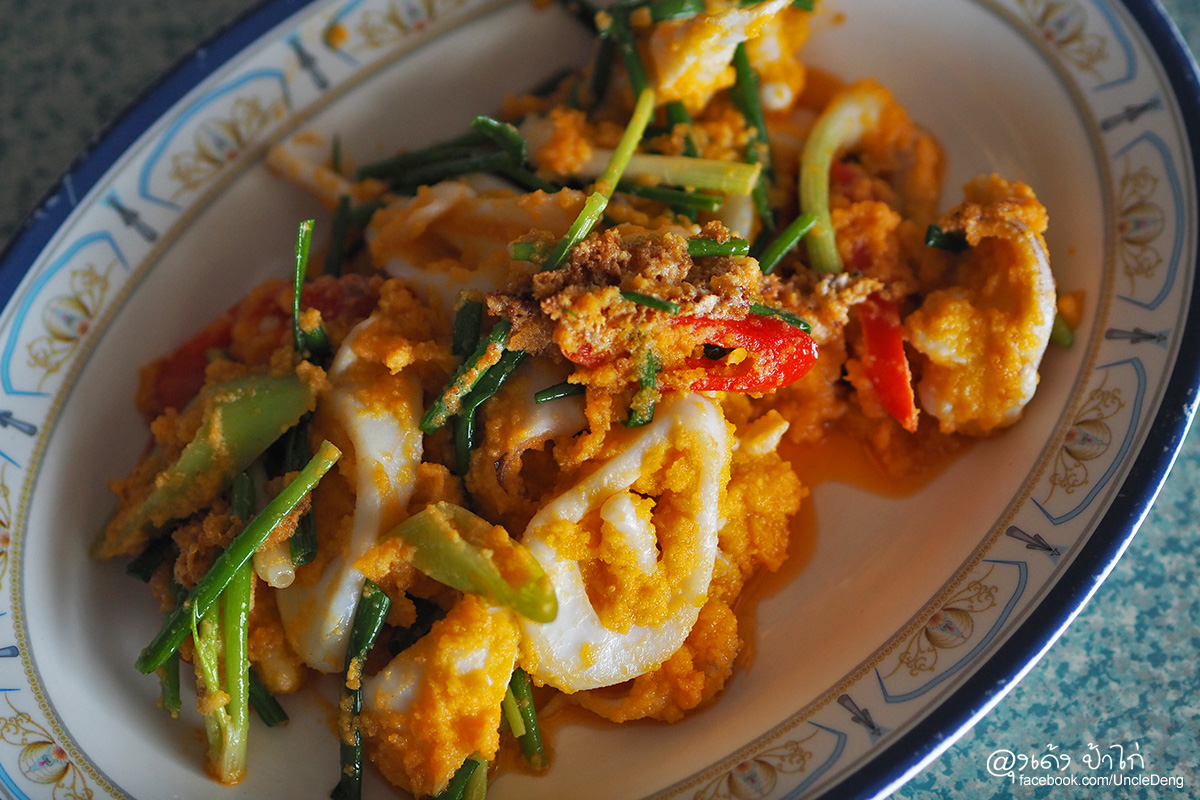 หมึกผัดไข่เค็ม จานนี้ใครชอบไข่เค็มก็คงถูกใจ เพราะใส่ไข่แดงเค็มมาเยอะมาก