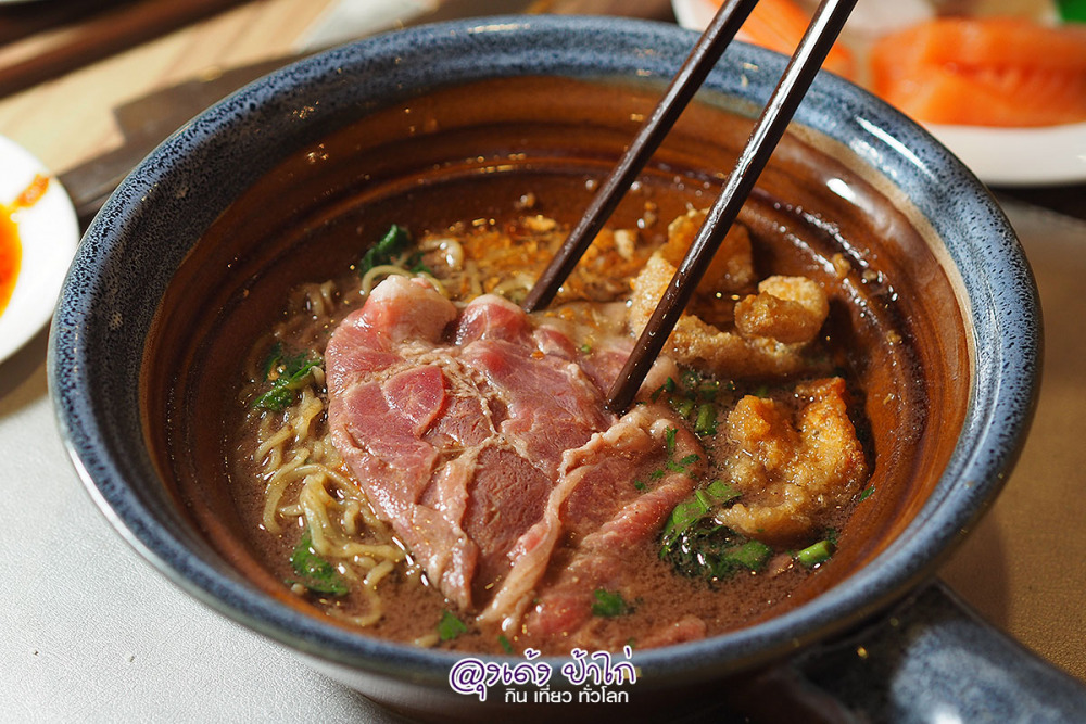 ก๋วยเตี๋ยวเรือ เนื้อวากิวสไลซ์ : เนื้อวากิวสไลซ์ความหนากำลังดีแผ่นใหญ่ เชฟใช้น้ำซุปร้อนๆ ราดบนเนื้อ เวลากินเราคลุกๆ รวมกัน เนื้อก็สุกพอดี - ชามนี้เชฟ ปรุงรสมาพอดี มีทั้งความ เข้มข้น เผ็ดพอประมาณ เปรี้ยวหวานมันเค็ม ครบรส